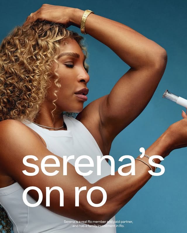 💉 Serena Williams está tomando, investindo em e divulgando GLP-1 (aka Mounjaro). Ela se uniu a Ro, uma farmacêutica americana que está tentando cada vez mais ser cool e quebrar o padrão das empresas do ramo. Todas as peças de divulgação miram em “não ter vergonha de assumir o uso do medicamento” e que usa-lo é uma escolha de saúde.
